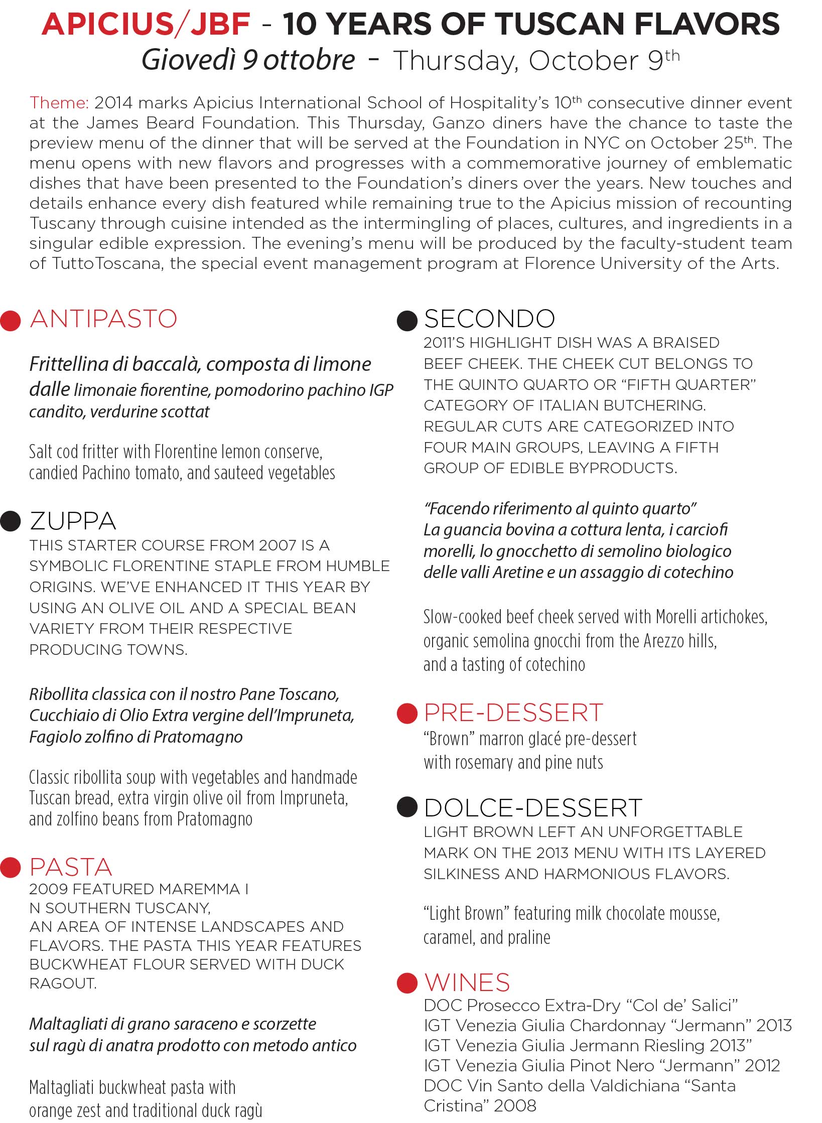 Tonight we are serving a preview of the JBF menu that will be featured in NYC. Diners at Ganzo in via de’Macci 85r have the opportunity to test the flavors and cooking techniques that our team will be utilizing in NYC. TT Florence team members Vicky Poull, Alix Osborn, and Lin Jo Chaio will be cooking with Executive Chef Andrea Trapani as their first trial run of a TuttoToscana event. Reservations can be made by calling 055 24 10 76. We hope to see you there! We will be reporting on the preview’s outcome over the next few days, keep an eye out for it!