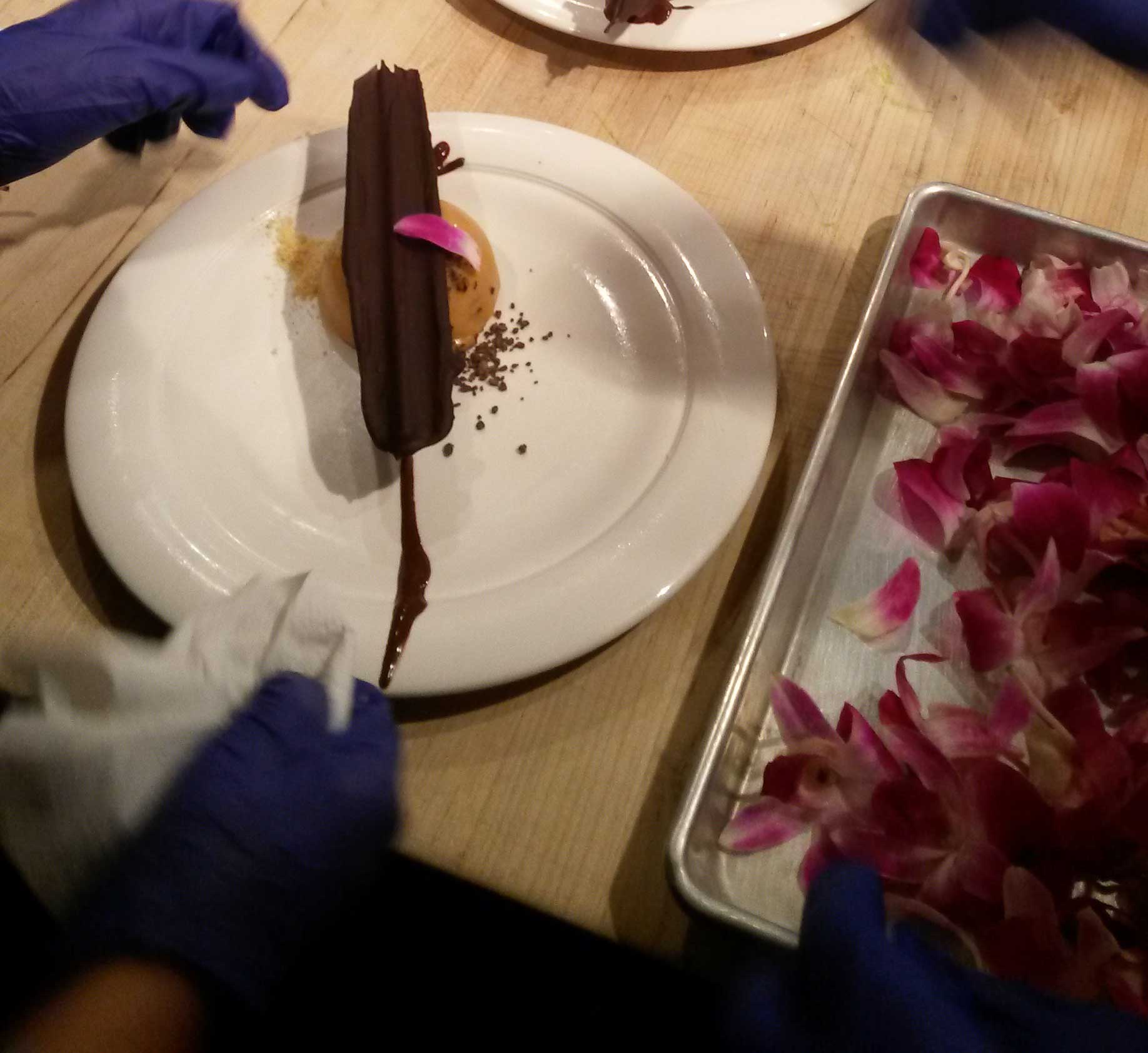 To round off the hardy meal, with dishes consisting of fried cod, duck ragout, and beef cheeks, we needed a subtle decrescendo to ease the palate into the dessert. For this we served a marron glacé as the pre-dessert, paired with rosemary and pine nuts. The aromatics of the rosemary and slight saltiness of the nuts help to keep the senses from being shocked when going from a dish as savory as beef cheek into something sweeter. For the main dessert we served a milk chocolate mousse with caramel and praline. Both of these dishes were paired with the Santa Cristina Vin Santo, and it truly shows the versatility of this wine. The development of aromatics and flavors of the wine follows the development of the dessert service. The apricot, orange blossom and dried fruit flavors you get when you first sip vin santo highlight the aromatics of the pre-desert. Just as the flavor begins to develop and you’re finishing up the marron glacé, you begin to sense a caramel, nutty finish to the wine. This finish perfectly accents the praline and the mousse of the main dessert.