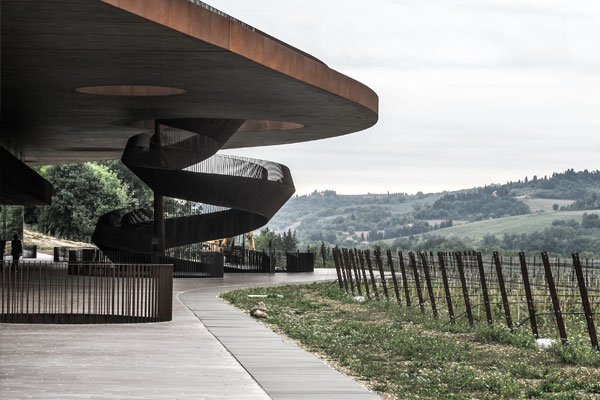 Santa Cristina’s site is located in Cortona, a town in northeastern Tuscany close to the Umbria border. In order to learn about the brand’s origins, we went to the headquarters of the Antinori parent group in Bargino, just outside of Florence in the Chianti Classico wine territory, where the company has recently completed an extensive wine complex. When we first arrived to the new facility, we all were very impressed with the sleek look that the new facility has taken on as well as the environmental efforts of the architectural design. The winery is designed to become part of the natural landscape, instead of taking from it. The facility was literally dug into the side of a hill to become a part of the natural scenery. Some of the high points of the facility are a dramatic staircase with visual similarities to Leonardo da Vinci’s gyro-copter, historic wine artifacts, a museum of the family’s art collection including contemporary art, the Rinuccio bistro where we completed our wine tasting, and a wine shop featuring the complete line of Antinori wine brands from Italy, the US, and Chile.